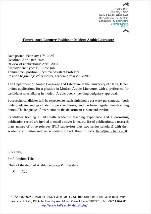 קול קורא לאיוש משרת חבר סגל בחוג לשפה וספרות ערבית